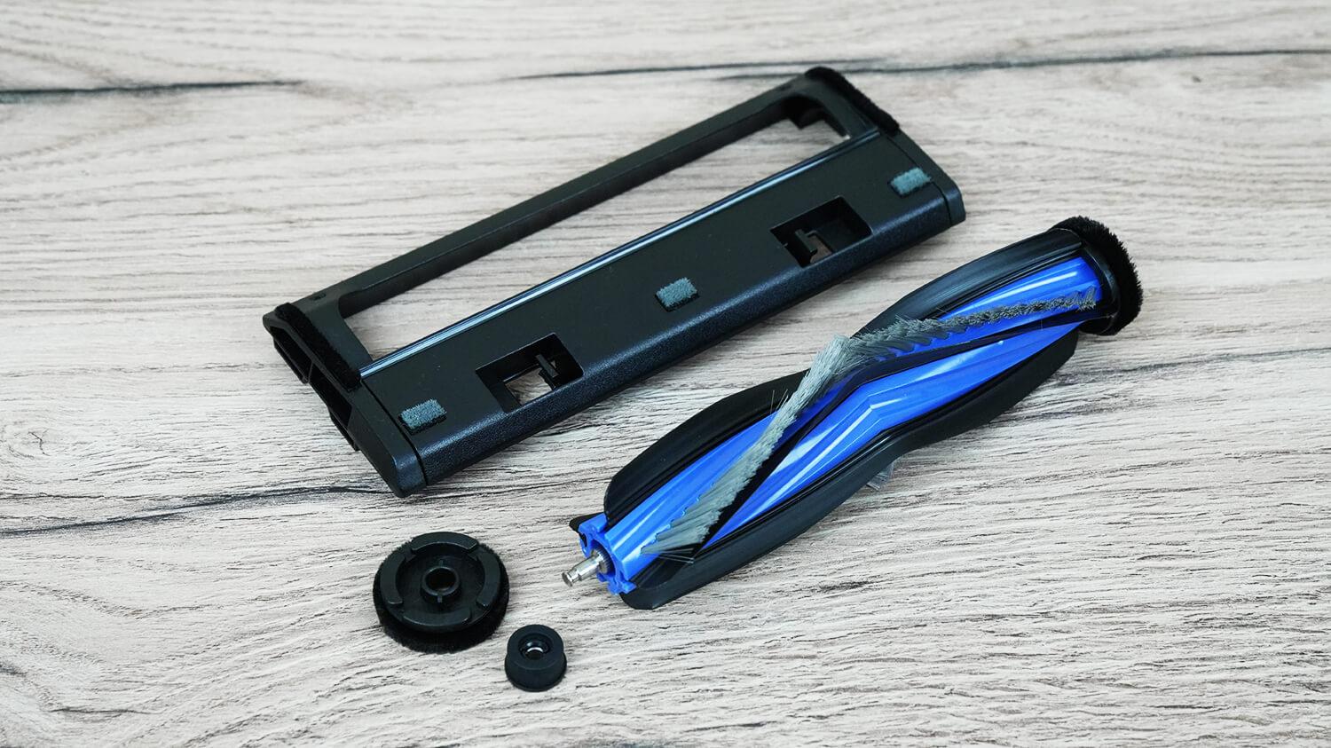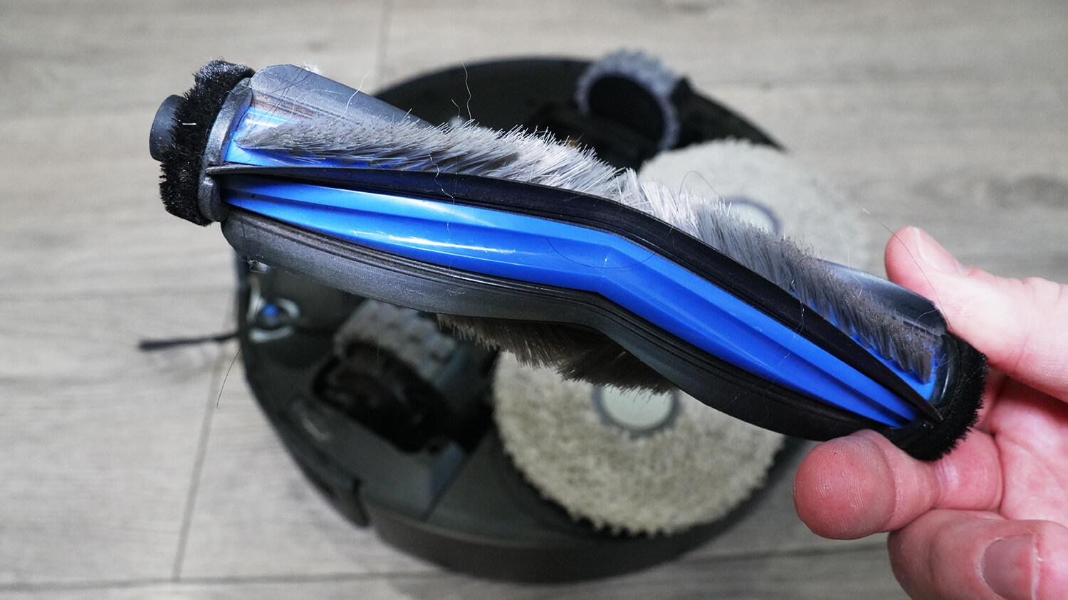 Посмотрим на состояние чистящего модуля. Видим, что боковая щётка намотала на себя немного волос, но основной удар приняла основная щётка, намотав по центру шерсть и волосы.