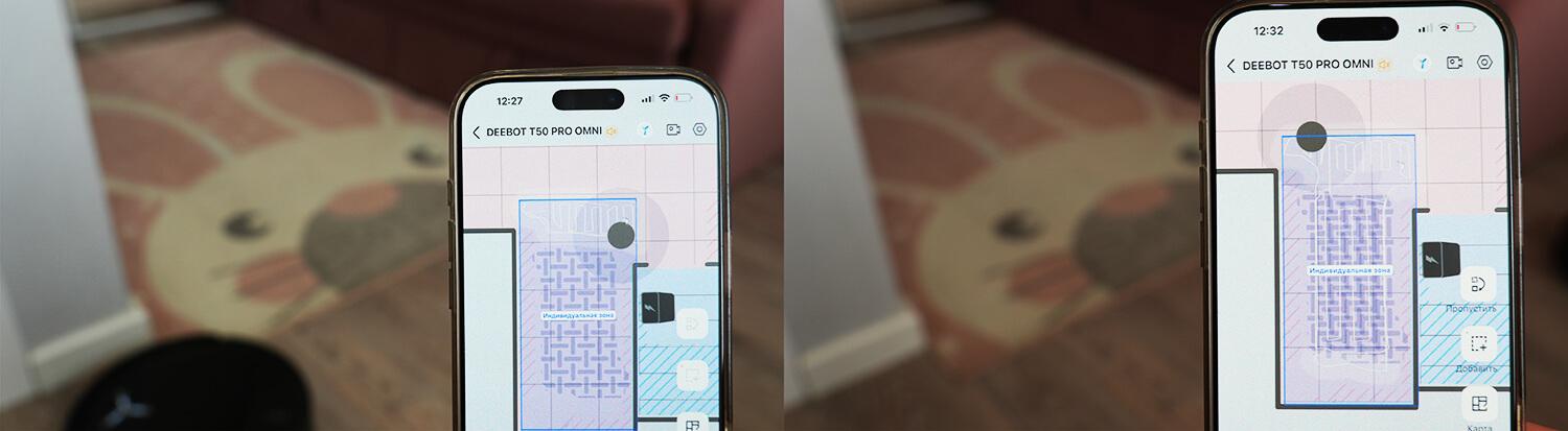 Говоря о влажной уборке при наличии ковров, есть несколько вариантов поведения робота. Выделю 2 самых интересных. Первый – включить функцию автоматического объезда ковра в режиме влажной уборки. Второй – подъем салфеток на ковре, дающий возможность роботу одновременно пылесосить и мыть пол, оставляя ковры сухими и чистыми.