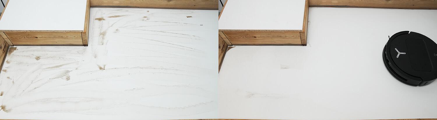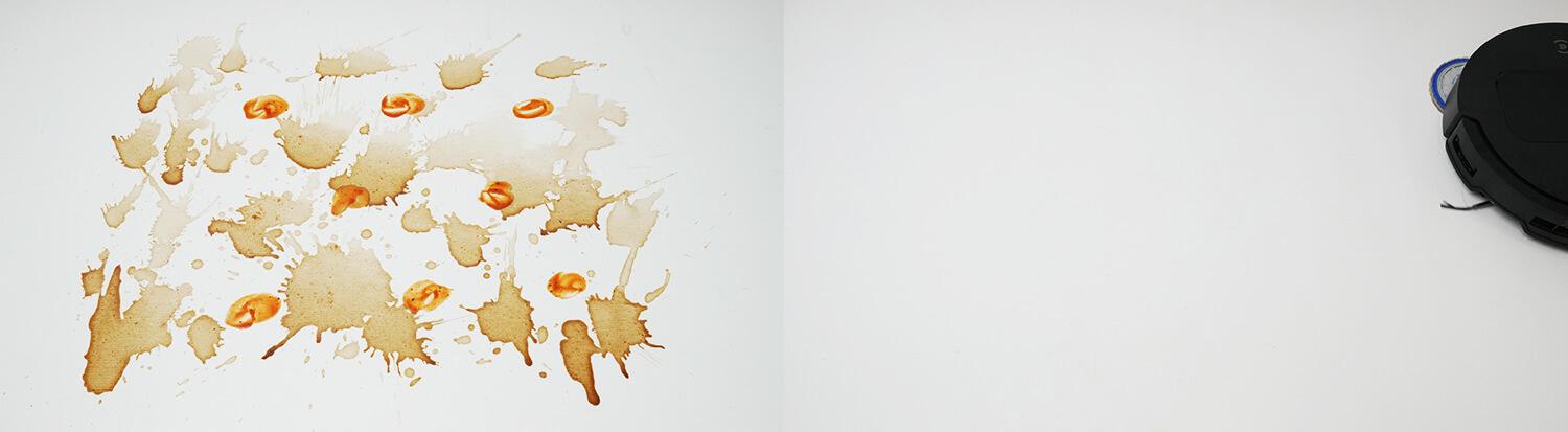 Что касается оттирания сложных загрязнений, робот смог оттереть даже засохшие пятна кофе и соуса. Да, не с первого раза. Если быть точным – с восьмого раза. И это хороший результат. Причем в этом тесте я не использовал моющее средство, так как в комплекте его не было. С моющим результат был бы ещё лучше.