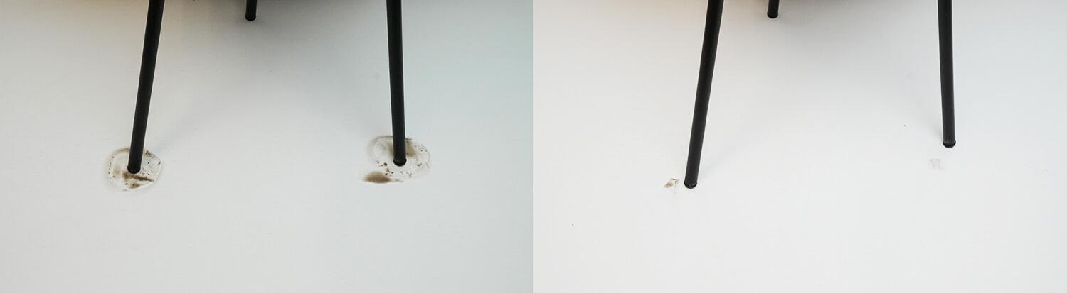 Отдельно проверил, как робот моет пол вокруг ножек стула. Видим, что салфетка выезжает и плотно проходит вокруг ножек стула, оставляя минимальные слепые зоны. Но тут правда и робот немного помогает, сдвигая ножки при объезде.