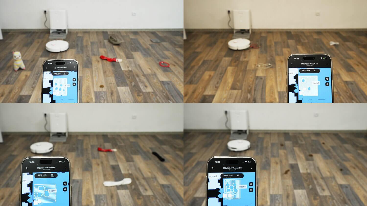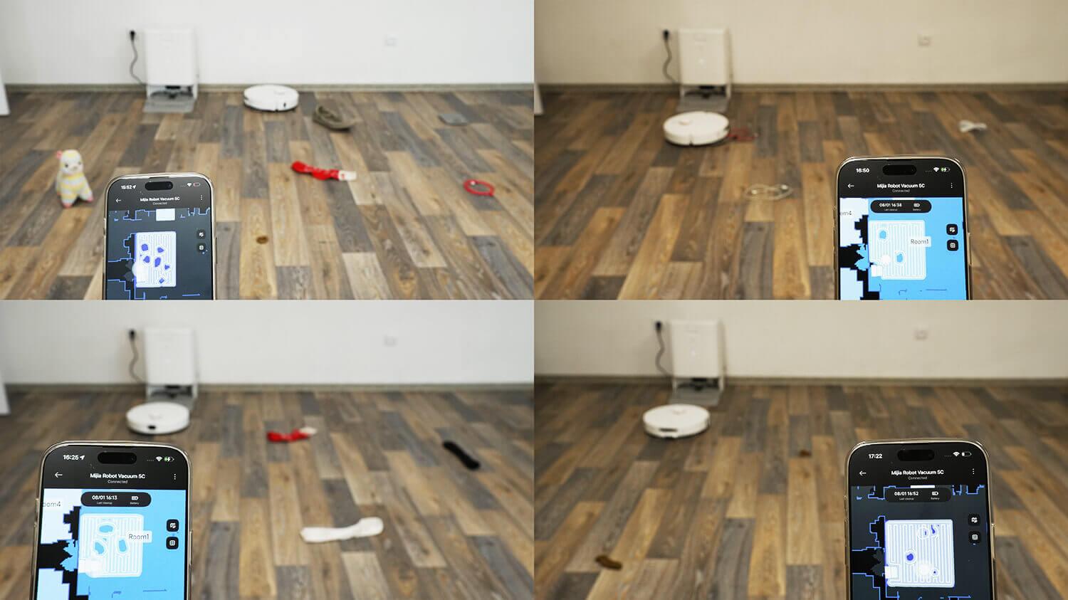 Ну и, наконец-то, переходим к тестам. Первым делом проверим навигацию Xiaomi Mijia 5C в комнате с препятствиями. После съезда со станции робот-пылесос проходит сначала по периметру помещения, потом убирает всю доступную площадь змейкой. Ножки сушилки он аккуратно объехал. Отдельно обмел вокруг коробки и хромированных ножек, промежуточно возвращаясь для промывки салфеток. Странных маневров не обнаружено, соответственно тест пройден успешно.