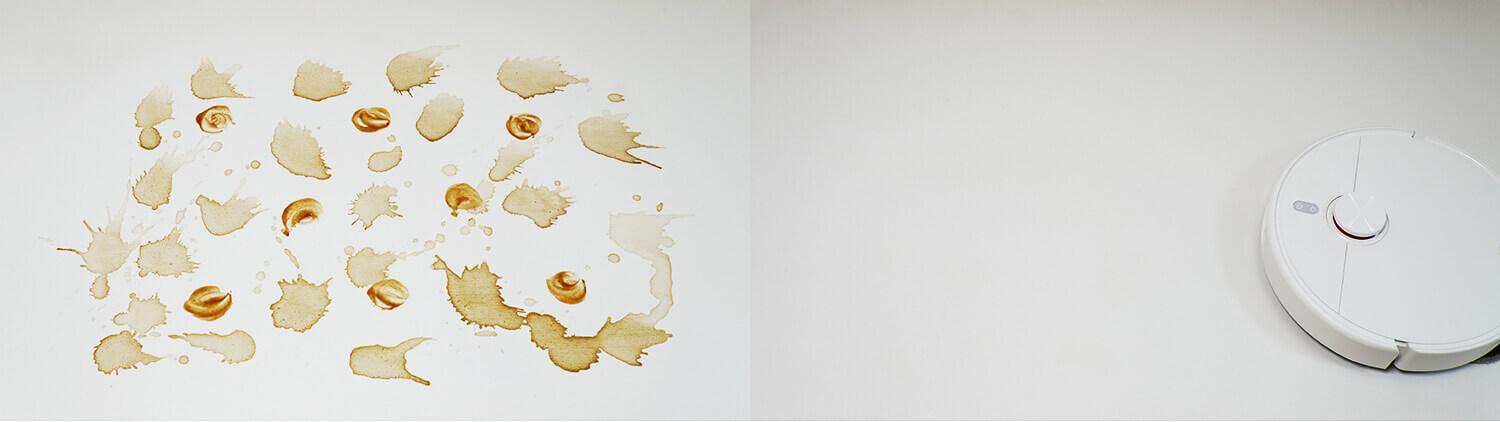 Что касается оттирания сложных загрязнений, робот смог оттереть даже засохшие пятна кофе и соуса. На удивление, ему потребовалось всего 6 проходов для устранения пятен и это очень хороший результат, на уровне премиальных аналогов. Причем нет ни подогрева воды, ни подмешивания моющего средства, да и салфетки самые обычные. Удивительно!