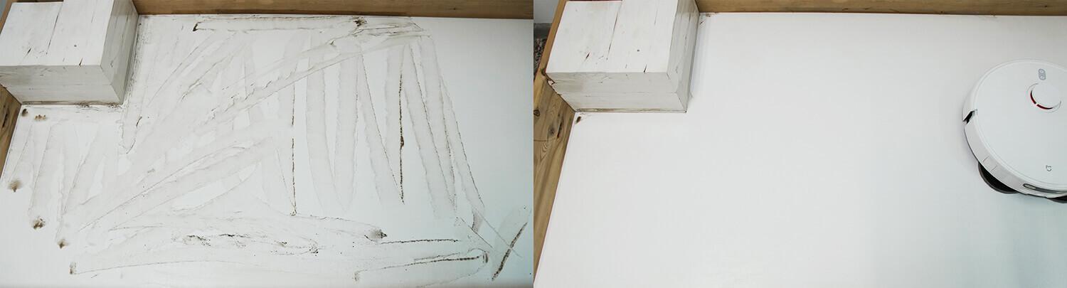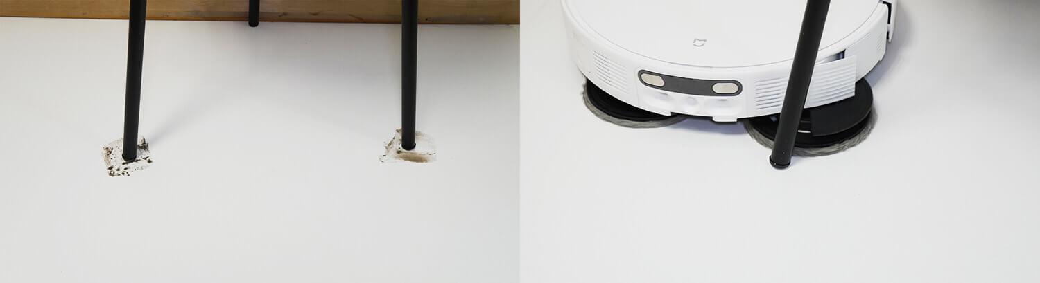Тут акцентирую внимание на том, что обновленный механизм выезда держателя действительно повышает эффективность мойки пола в углах, как внутренних, так и внешних, а ещё робот-пылесос тщательнее промывает пол вокруг ножек стульев. Видите, что грязи вообще не осталось. Это плюс!