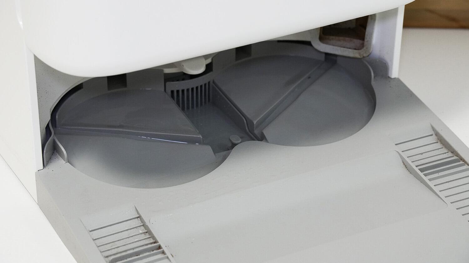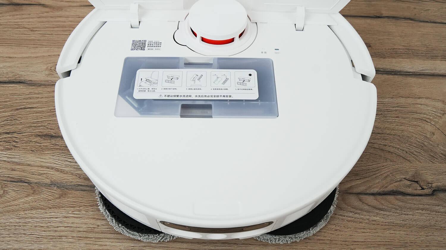 Пылесборник находится под верхней крышкой. Система фильтрации только на базе HEPA-фильтра, который разрешается промывать водой. Объем контейнера около 290 мл. Бака для воды в роботе нет. Салфетки смачиваются только на станции при стирке.
