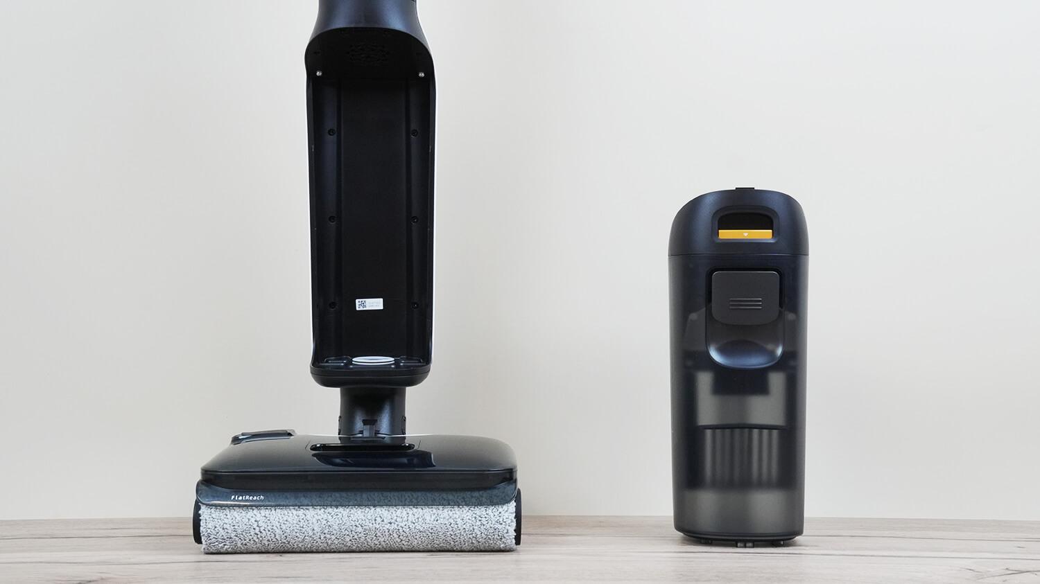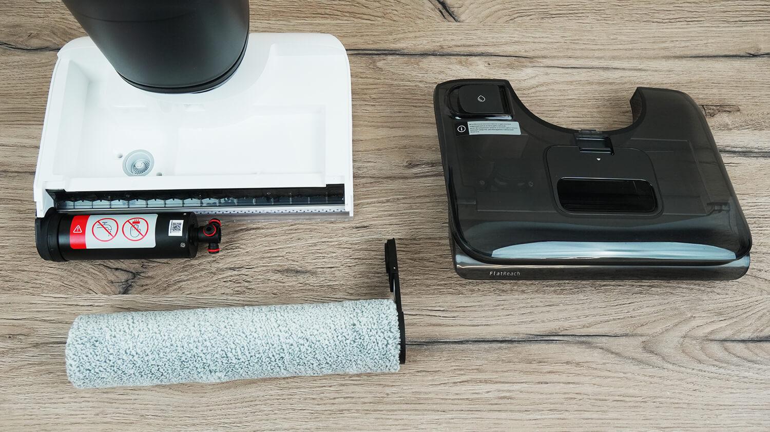 Разберёмся, как устроен Roborock F25 LT. Корпус выполнен в черно-белом. Принцип работы привычный для моющих вертикальных пылесосов: роллер постоянно смачивается чистой водой во время вращения, после чего грязная вода вместе с соскребается и сразу отправляется в резервуар для отработанной жидкости.