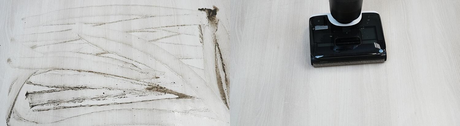 С более привычными следами грязи он также справляется быстро и аккуратно: покрытие очищается без разводов, а следы после прохода не остаются.