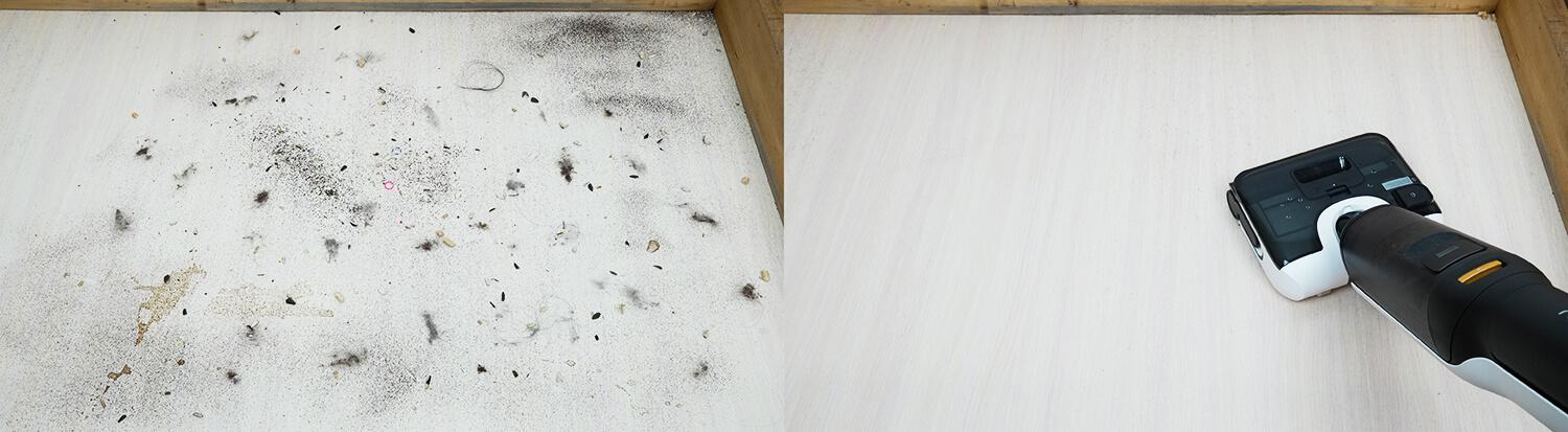 Помимо мойки пола, пылесос можно использовать и для сбора мусора. На твердых покрытиях он показал хороший результат, собрав основную часть мусора. С крупными фракциями, вроде гранул наполнителя, возникают небольшие нюансы — роллер не способен их захватывать. Впрочем, критичным это назвать сложно: устройство изначально заточено под мойку пола, а не замену обычного пылесоса для сухой уборки. Для таких целей лучше использовать хотя бы Combo‑версию.