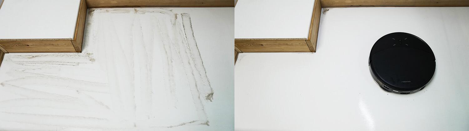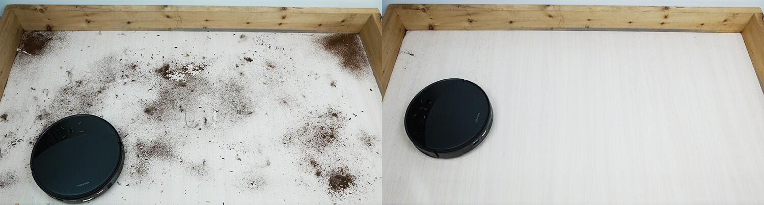 Качество сбора разного по структуре мусора на ламинате хорошее. Причем благодаря выдвижной боковой щётке этому роботу удалось даже вычистить мусор в углах.