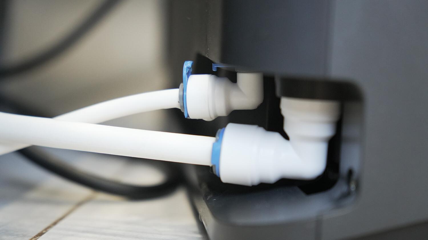Слив организовал через тройник, установленный под мойкой. Купил заглушку на тройник, высверлил в ней подходящее по диаметру отверстие, вставил трубку и залил герметиком. Тут производитель рекомендует подключать трубку к сливу не выше, чем на 50 см от пола.