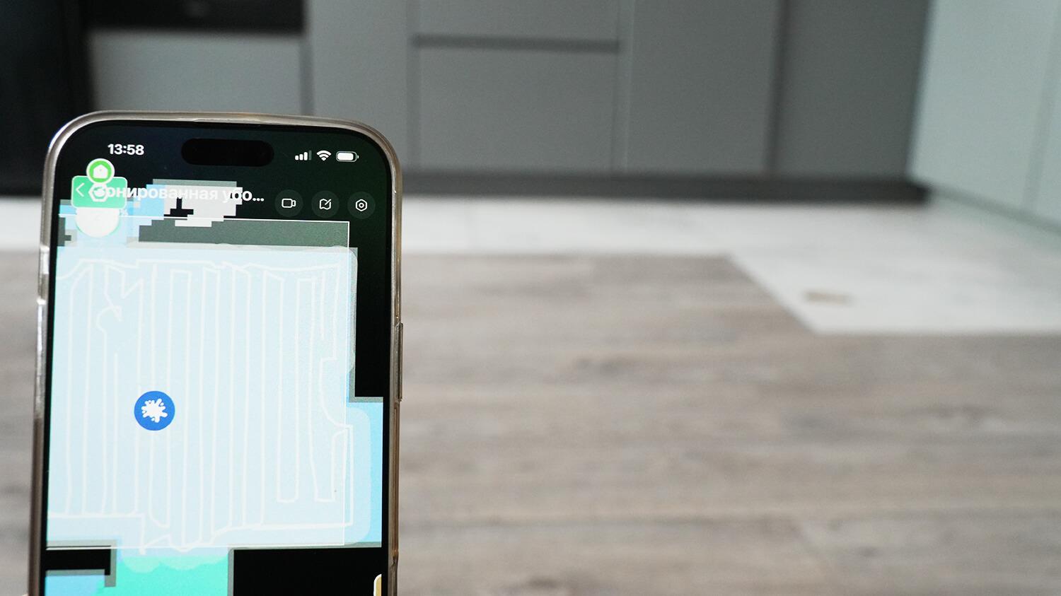 Ну и наконец-то переходим к тестам! Первым делом проверим навигацию Roborock Saros 10R в комнате с препятствиями. Робот-пылесос прошёл сначала вокруг ножек столика, потом по периметру помещения, после чего приступил к уборке всей доступной площади змейкой. Ножки сушилки робот аккуратно объехал, отдельно обмел и вокруг коробки. Зеркало внесло погрешность в построение карты, что является типичной проблемой для большинства роботов-пылесосов. В целом, поведение не вызвало вопросов, неубранных участков не осталось, так что тест пройден успешно.