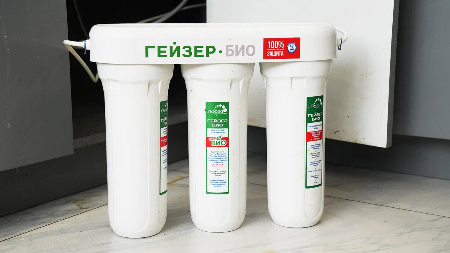 К водопроводу я подключил станцию через обычную систему фильтрации под мойкой типа Гейзер. Давления воды на выходе хватает для нормального функционирования системы. Производителем кстати заявлено минимальное давление в 0,1 МПа (мегапалскаль).