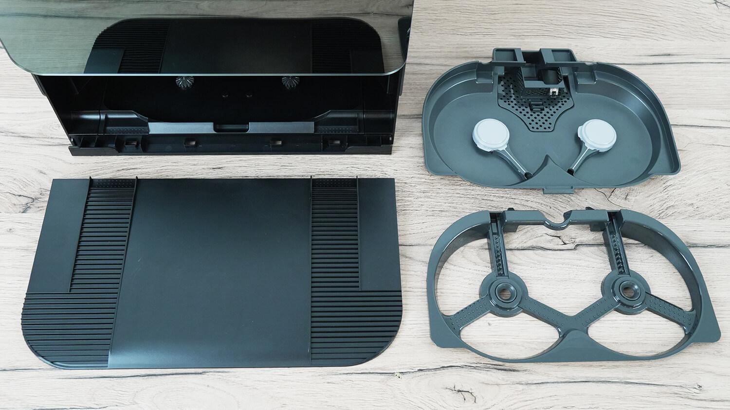 Но вот что касается отсутствия доступа к встроенным бакам в станции, я даже разобрал её, чтобы посмотреть, как внутри всё организовано, и нуждается ли станция в обслуживании внутренних узлов. Так вот к баку для чистой воды есть доступ после снятия защитных крышек, а вот бак для грязной воды тут вообще неразборный.