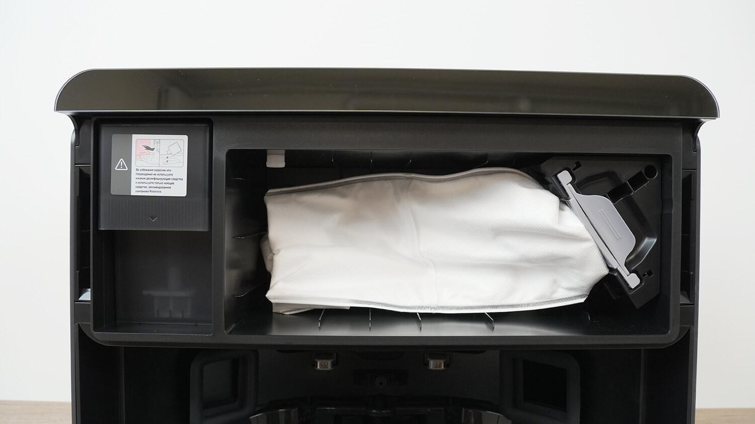 Пылесборник размещен под верхней крышкой, которая удерживается на магнитах. Контейнер, как и фильтр, можно промывать водой. Система фильтрации на базе HEPA фильтра. В робот также встроен скрытый бак для воды. Вода закачивается внутрь автоматически на станции.
