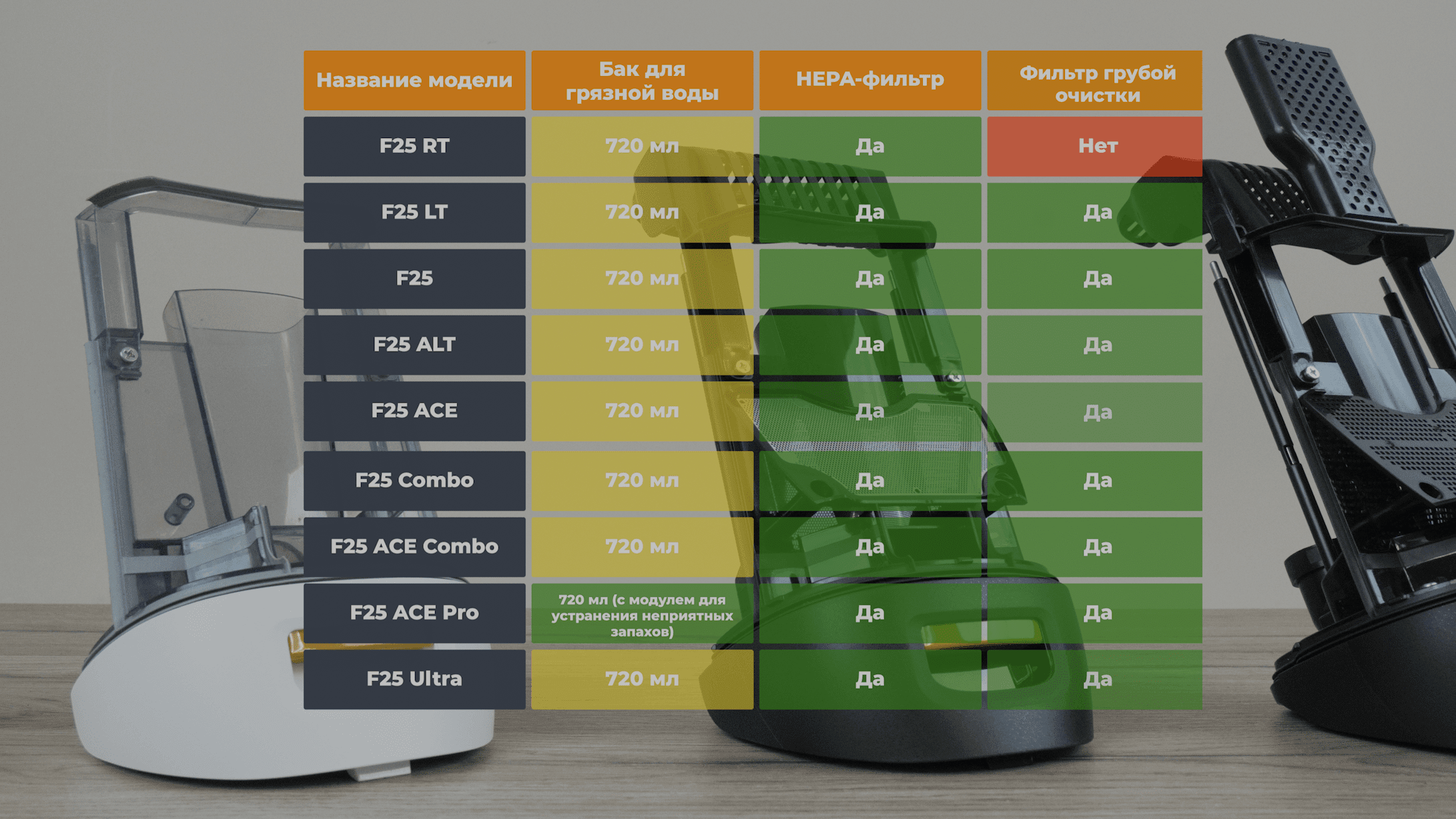 Что в итоге? Как вы видите, на первый взгляд очень похожие моющие вертикальные пылесосы, на самом деле имеют множество отличий между собой, от чего и цена сильно отличается. Собрал все параметры в одну таблицу, с указанием диапазона цен, чтобы вы могли удобно сравнить для себя их: