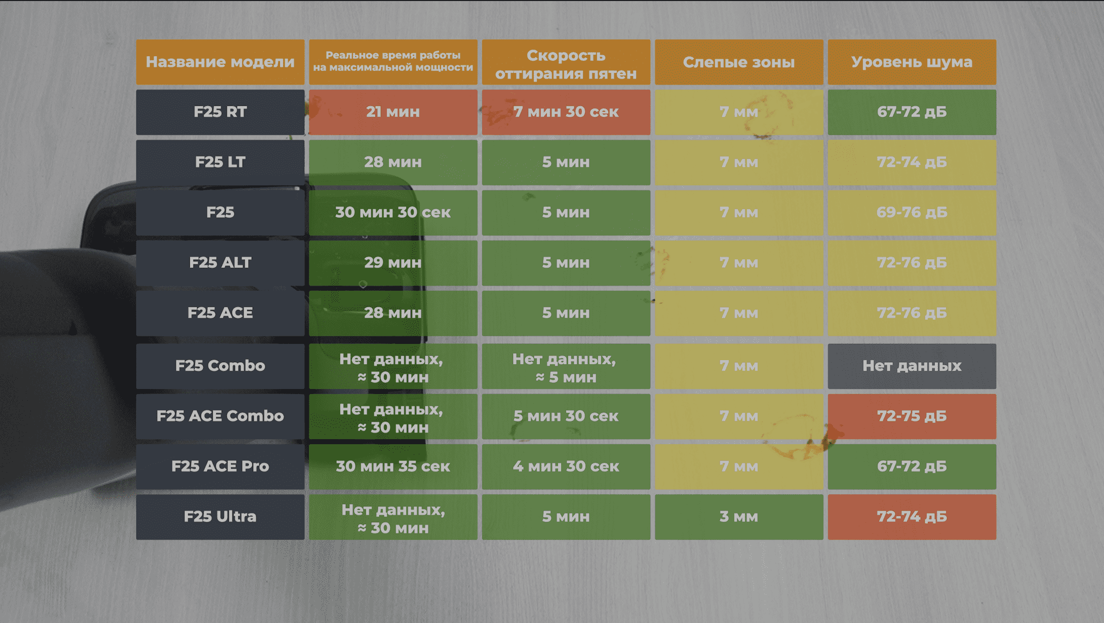 Тут отмечу, что единственный моющий пылесос, которого не было на обзоре – это Roborock F25 Combo. Что касается времени работы, ранее я не замерял этот показатель, но видно, что у всех он примерно одинаковый не считая RT-версии, у которой заметно слабее аккумулятор. А так по качеству мойки пола и оттирания загрязнений все пылесосы примерно одинаковые, опять же, не считая RT-версии.