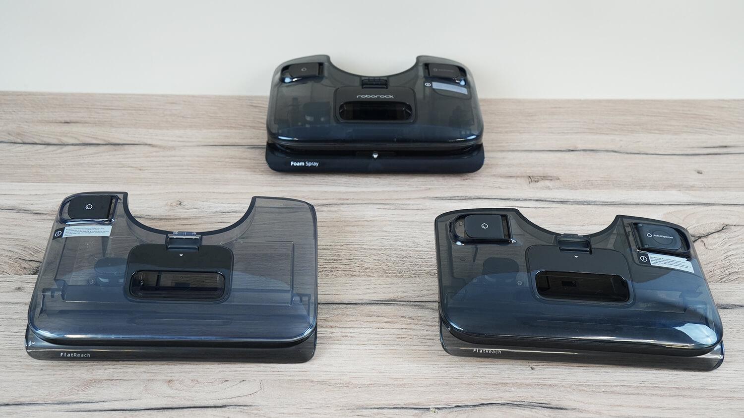 Сравним конструкцию моющих вертикальных пылесосов Roborock F25-й серии начиная с баков для чистой воды, т.к. роллеры у всех 9 моделей идентичны. Самый простой вариант исполнения – это когда бак для чистой воды с одной крышкой – только для залива воды. Улучшенный вариант этого бака – это когда помимо резервуара для воды предусмотрен ещё и отсек для автоматического подмешивания моющего средства. И вот третий вариант конструкции – когда помимо двух отсеков для воды и моющего есть ещё и специальная форсунка для подачи чистящей пены.