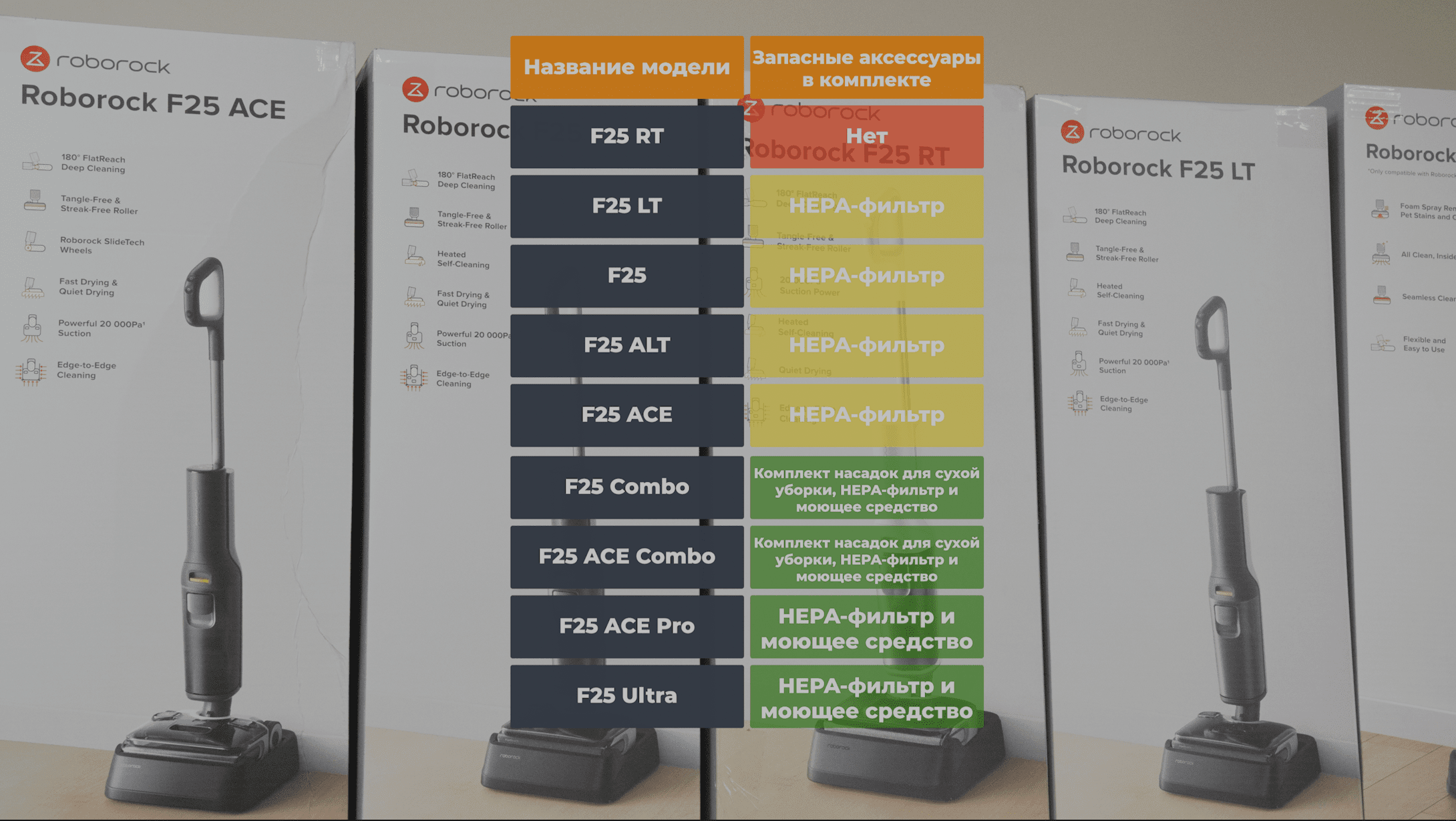 Кстати, сами комплектации тоже отличаются, как ни странно. В таблице сравнил все комплектации F25-й линейки Roborock:
